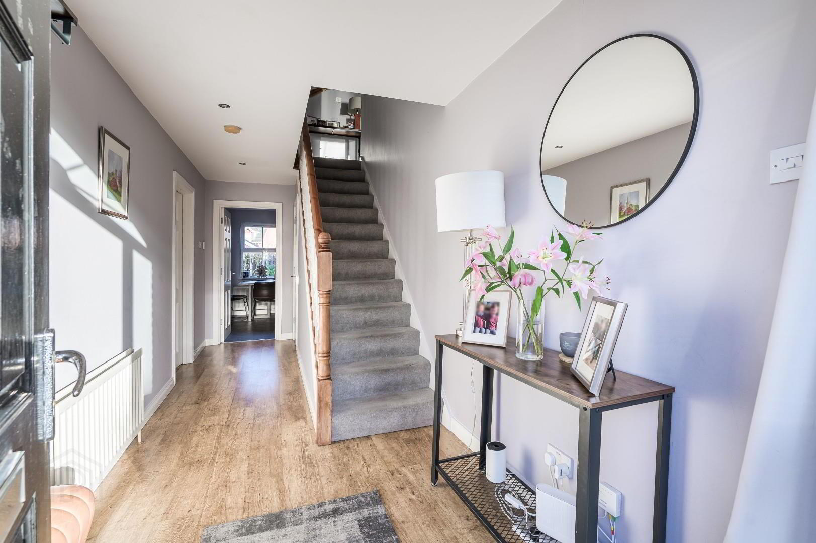 - A spacious entrance hall with stairs facing you on the right hand side. Wood flooring & a door on your left leading into the living room with a door straight in front leading into the kitchen dining area