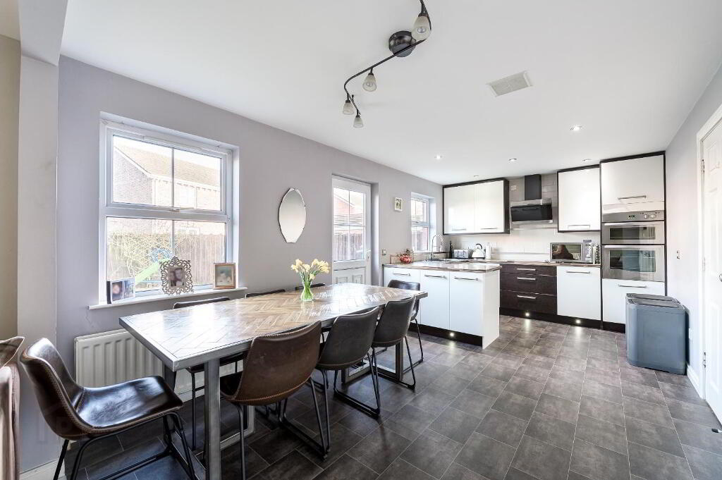 A wonderful space including a modern kitchen with a combination of high and low level units. A second living space with clear views out to the rear garden and ample room for family dining.