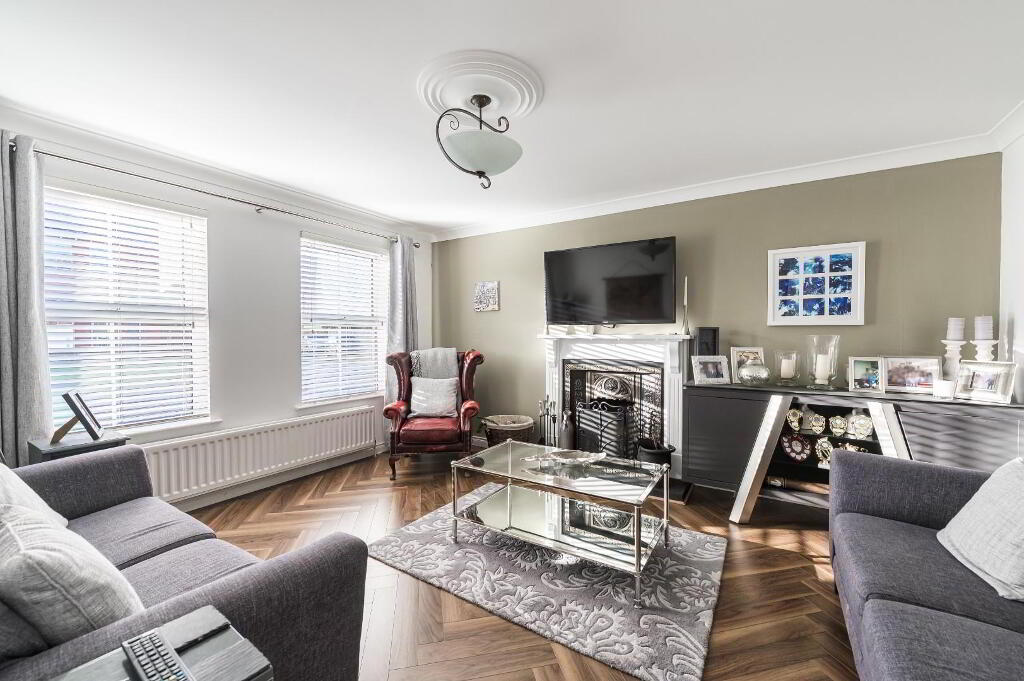 Lovely bright family living room with a fireplace and wood flooring. 2 large front windows letting in plenty of natural light