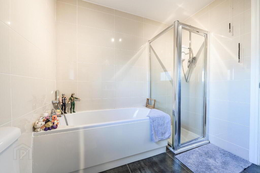 Good size modern family bathroom with separate bath and shower unit, wash hand basin & toilet. Tiled flooring and walls. Window to the rear