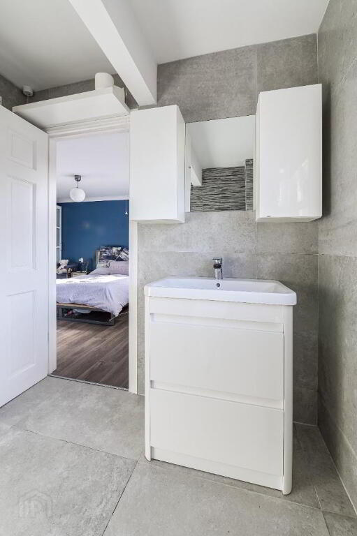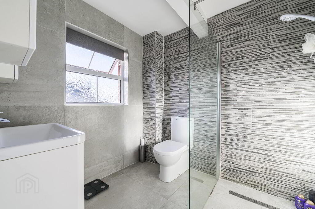 Stunning en-suite shower room with Shower unit, wash hand basin & toilet. Tiled flooring & walls. Window to the front.